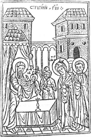 Розповідають святі Отці, що святий пророк Захарія, батько Предтечі, Пречисту Діву, що увійшла задля очищення у церкву з дитинчам, поставив не на місці жінок, що очищаються, але на місці дівчат, на якому ж жінкам, що мужа мають, стояти не годиться. І коли книжники і фарисеї те бачили, то почали обурюватися, - Захарія став проти них, повідомляючи, що та Мати й після народження є Дівою чистою. Коли ж вони не вірили, розповідав їм святий, що єство людське зі всіляким творінням підкоряється Творцеві своєму, і в Його всесильній руці є, як же хоче влаштувати творіння Своє і зробити, щоб Діва народила й після народження залишилася Дівою. Через те бо й цю Матір не відлучив, казав, з місця дівчат, бо Дівою є справжньою. У той же час, коли внесли батьки дитинча Ісуса, щоб зробити за звичаєм законним щодо Нього, прийшов до церкви, Духом Святим ведений, святий Симеон-старець, чоловік праведний і благочестивий, який сподівався утіхи Ізраїлеві, що мала настати з приходом Месії. Знав-бо, що зближається вже сподіваний Месія, адже вже скіпетр від Юди перейшов до Ірода, за пророцтвом праотця Якова Патріярха, який передрік, що не піде князівство від Юди, поки не прийде сподівання народам Христос Господь, також і Даниїлові сімдесят тижнів вже скінчилося, після них же провіщено було бути приходу Месії. До того ж обіцяно було Духом Святим Симеонові не бачити смерти швидше, ніж побачить Христа Господнього. Він, поглянувши на Пречисту Діву і на Дитинча, що вона тримала, бачив благодать Божу, що огортала Матір із Дитинчам, і, пізнавши духом, що це є Месія очікуваний, приступив з ревністю і, прийнявши Його на руки з радістю невимовною і з благоговійним страхом, дяку велику підніс Богові, наче лебідь білий сивиною прикрашений, весело перед кончиною своєю співаючи і говорячи: "Нині відпускаєш раба Свого, Владико, за словом Твоїм, з миром. Не мав, — казав, — спокою у думках своїх у всі дні, на Тебе чекаючи, і з дня на день журився, коли Ти прийдеш, нині ж, Тебе бачивши, спокій отримав і печалі позбувся, відходжу звідси, радісну несучи вістку батькам своїм, сповіщу-бо про Твій у світ прихід праотцеві Адаму, й Аврааму, Мойсею ж, і Давидові, Ісаї та иншим святим Отцям і пророкам і невимовної радости сповню тих, що дотепер журилися. До них же мене швидко відпусти, аби швидко, відклавши печаль, возвеселилися в Тобі, Ізбавителі своєму. Відпусти мене, раба Свого, спочити по багатолітніх трудах на лоні Авраамовому, вже-бо бачили очі мої спасення Твоє, для всіх людей приготоване. Бачили очі мої світло, приготоване для вигнання пітьми, на просвітлення народів, для відкриття невідомих їм Божественних таїн, світло, що засіяло на славу людей Твоїх Ізраїля, яке через пророка Ісаю Ти обіцяв, говорячи: "Дам на Сіоні спасення і в Ізраїлі славу Свою". Чуючи ж таке від святого праведного старця про отроча, Йосиф і Пречиста Діва дивувалися мовленому про Нього, бачили-бо Симеона, що до Немовляти промовляв не як до немовляти, але як до старого днями, і молився не як до чоловіка, але як до Бога, що має владу над життям і смертю, що може старця зразу до иншого життя відпустити або ще в теперішньому затримати. І благословив їх Симеон, хвалячи і величаючи Пренепорочну Матір, що народила у світ Богочоловіка, і прославляючи названого батька, святого Йосифа, який сподобився бути служителем для такого таїнства. Сказав же д