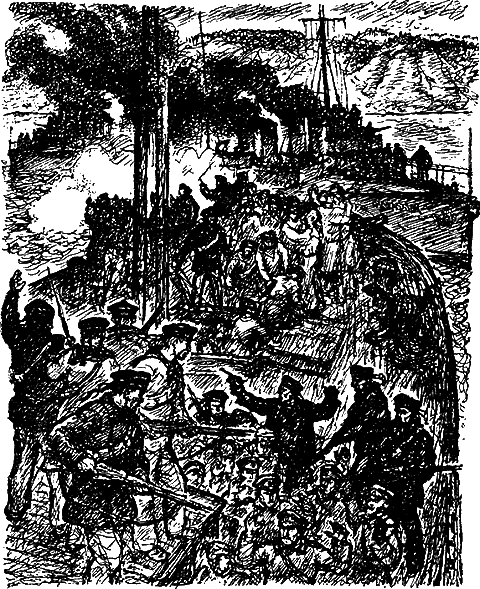 Вышли. Наконец и село Гольяны показалось за поворотом реки. А посреди реки — баржа. На ней — охрана. С берега на баржу наведены пушки и пулеметы. Подошли наши миноносцы к барже, развернулись. Часовые с баржи их окликают: «Кто плывет?» С миноносцев — приказ: «Барже поднять якоря! Приготовиться к буксировке!»