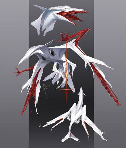 Что бы это ни было, самолёт оно напоминало лишь формой. Огромное гигантское чудище, размером с ТУ-160, прямо сейчас садилось в поле, используя вертикальные движки. Перед самой землей, тварюга сложила крылья, как летучая мышь или птерозавр, и аккуратненько приземлилась, разгоняя пыль вокруг себя. Рёв двигателей угас, и я смог рассмотреть её поближе. Белая, с красными прожилками по всему…как это слово…фюзеляжу? Корпусу? Телу? Вот как их классифицировать? Она же живая.