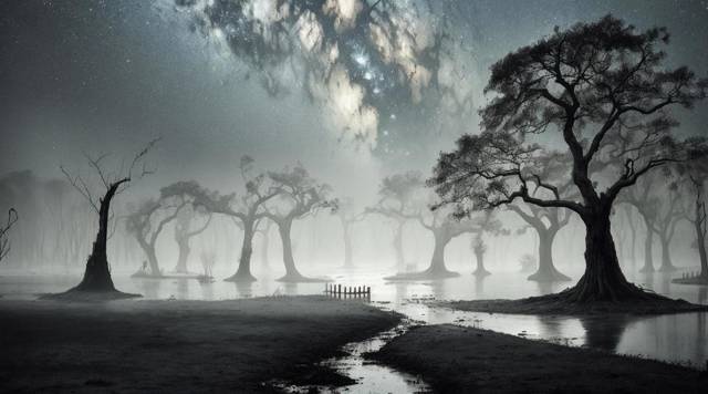 Я оказался посреди мрачного болота. Вокруг простирались топи со стоячей черной водой. Небо было усыпано мириадами незнакомых звезд. Их холодный свет едва пробивался сквозь серую мглу. Казалось, это место никогда не видело света, а полумрак, который открылся передо мной — это постоянное явление здесь.