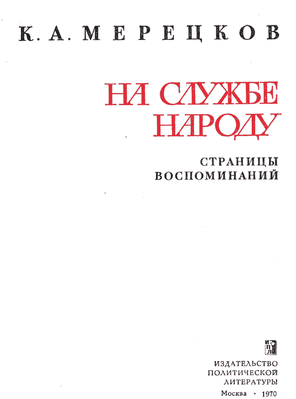 Полководческая биография Маршала Советского Союза Кирилла Афанасьевича Мерецкова является характерным примером роста наших советских военачальников, вышедших из народных масс, воспитанных Коммунистической партией и выдвинутых ею на самые высокие посты военной деятельности. Родившись в бедной крестьянской семье, Кирилл Афанасьевич до 15 лет растет в деревне, затем уходит в город и становится рабочим, а через пять лет участвует в революционных февральских и октябрьских событиях, вступает в большевистскую партию. Далее его жизнь неразрывно связывается с нашей славной Советской Армией. Он мужественно сражается на фронтах гражданской войны, активно участвует в строительстве, укреплении и развитии Советских Вооруженных Сил, борется против фашизма в войсках республиканской Испании, а по возвращении на Родину снова все свои силы, знания и опыт отдает делу укрепления обороны нашей страны. Наиболее ярко проявляется талант советского военачальника К. А. Мерецкова в годы Великой Отечественной войны, когда он командует войсками ряда армий и фронтов.
