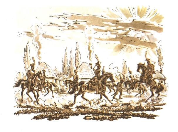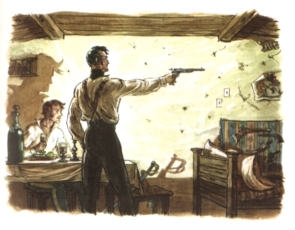 Один только человек принадлежал нашему обществу, не будучи военным. Ему было около тридцати пяти лет, и мы за то почитали его стариком. Опытность давала ему перед нами многие преимущества; к тому же его обыкновенная угрюмость, крутой нрав и злой язык имели сильное влияние на молодые наши умы. Какая-то таинственность окружала его судьбу; он казался русским, а носил иностранное имя. Некогда он служил в гусарах, и даже счастливо; никто не знал причины, побудившей его выйти в отставку и поселиться в бедном местечке, где жил он вместе и бедно и расточительно: ходил вечно пешком, в изношенном черном сертуке, а держал открытый стол для всех офицеров нашего полка. Правда, обед его состоял из двух или трех блюд, изготовленных отставным солдатом, но шампанское лилось притом рекою. Никто не знал ни его состояния, ни его доходов, и никто не осмеливался о том его спрашивать. У него водились книги, большею частию военные, да романы. Он охотно давал их читать, никогда не требуя их назад; зато никогда не возвращал хозяину книги, им занятой. Главное упражнение его состояло в стрельбе из пистолета. Стены его комнаты были все источены пулями, все в скважинах, как соты пчелиные. Богатое собрание пистолетов было единственной роскошью бедной мазанки, где он жил. Искусство, до коего достиг он, было неимоверно, и если б он вызвался пулей сбить грушу с фуражки кого б то ни было, никто б в нашем полку не усумнился подставить ему своей головы.