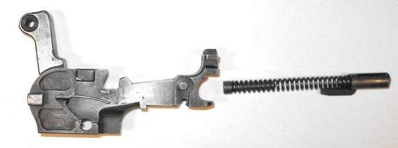 Разборка ударно-спускового механизма пистолета Маузер К-96 (Mauser C96) заканчивается отделением шептала с пружиной вправо, после чего курок сам отделиться от вкладыша, так как часть пружины шептала является его осью.