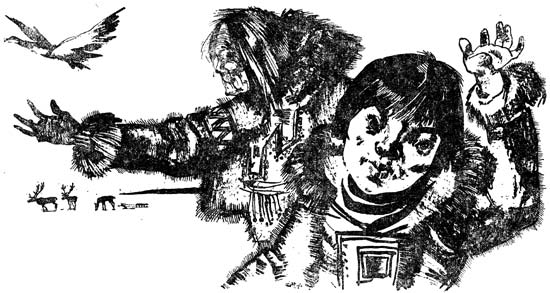 — Хутэ[3],— говорит потом она внуку, — брось еще немножко соли на дорогу священным птицам. Пусть их аргиш [4] будет счастливым. На будущий год они найдут свой след и принесут нам тепло и лето.