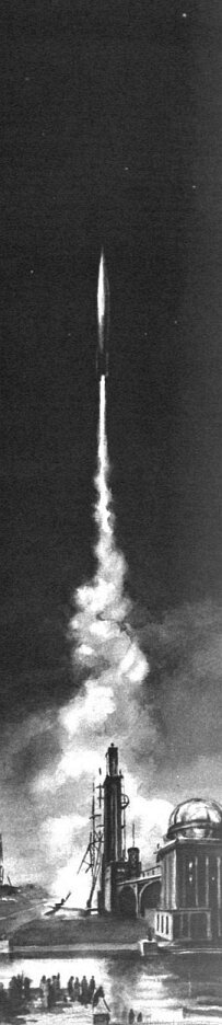 Автомобиль мчался по шоссе. Неожиданно показалась отливающая серебром огромная ракета «СССР-17». Примыкая к высокой башне, она, заостренная, словно стрела, целилась в спокойное вечернее небо. Быстроходный лифт поднял нас наверх, и мы очутились на площадке, соединенной с кораблем. Здесь находились директор нашего института и представители Академии наук СССР.