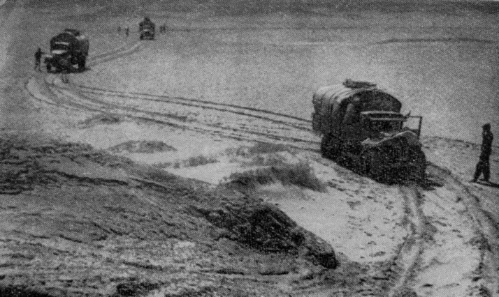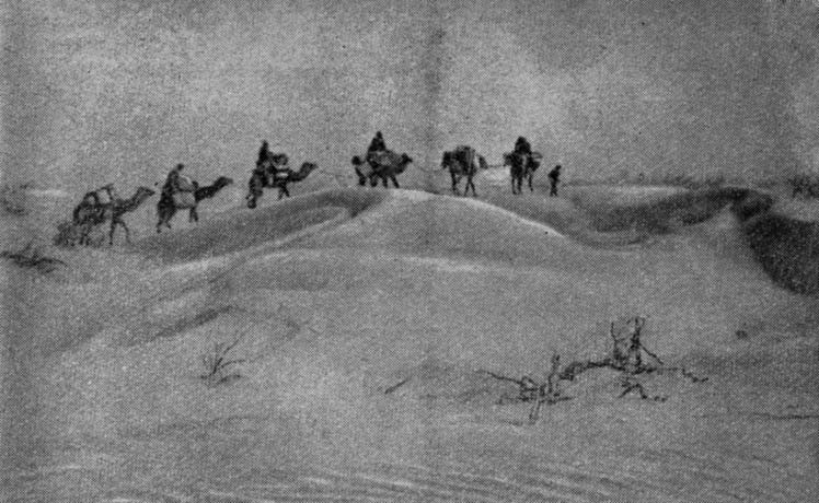 Незаметно промелькнуло пригородное асфальтированное шоссе, и тяжело загруженные экспедиционные машины выехали на грейдер. Позади осталась свежая весенняя зелень окраин Нукуса. По обеим сторонам дороги тянутся невысокие разбитые песчаные увалы, растрескавшиеся и обветренные коричневатые камни да вылезающие прямо из песка редкие серые колючки. Свежий восточный ветер поднимает песок, и тонкие струйки его, как живые, перебегают дорогу у колес головной машины. Постепенно, отклоняясь к востоку от Аму-Дарьи, хорошо накатанная дорога уводит в пустыню.