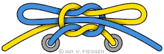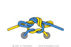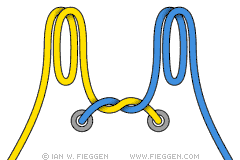 2. Безопасный узел Ian Fieggen. Сделайте две петли, и просуньте их через «дыру» в середине. Готовый узел помимо прочности ещё и красив, симметричен, его обвивают два завитка шнурков.