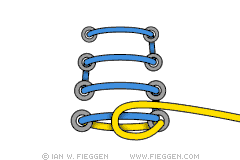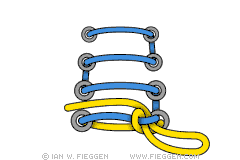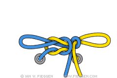 1. Самый любимый способ, которым пользуется сам автор Ian Fieggen, носит его имя. Ian любит этот способ за быстроту, удобство, красоту и надёжность. Сделайте петлю с каждым из концов шнурка и одновременно выводите их через друг друга, тем самым мгновенно формируя узел.