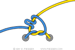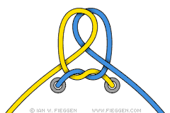 13. Скрещенный узел Ian Fieggen. Петли тоже продеваются друг в дружку, но немного иначе, чем в обычном узле Ian Fieggen (обратите внимание на направление концов шнурков).