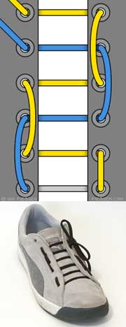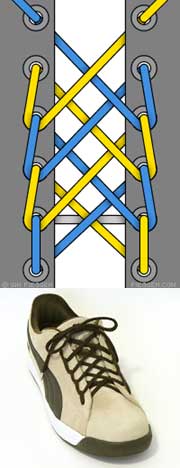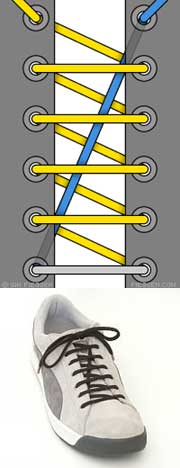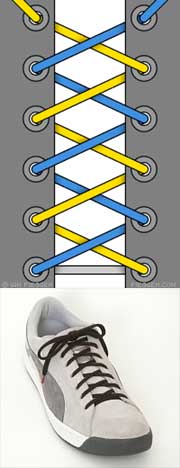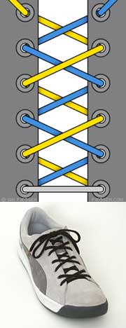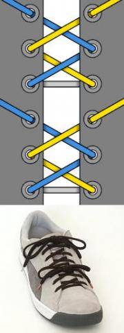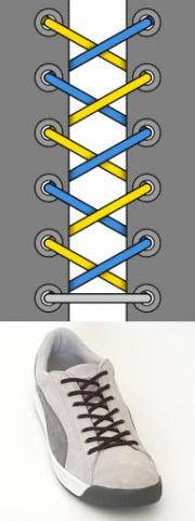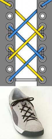 Шнурок пропускается через нижние дырки и выводится наружу с обоих концов. Концы пересекаются, а затем пропускаются изнутри наружу через отверстия. Доходите до верхних дырочек и завязываете шнурки. Этот метод лёгок и удобен; сминает ботинок, а не ногу.
