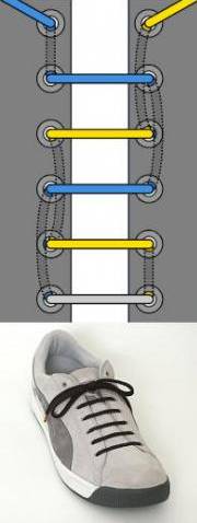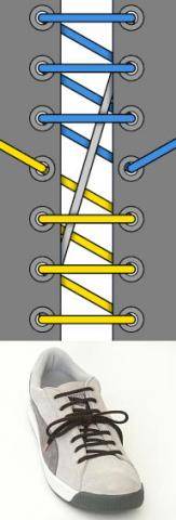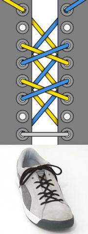 Очень декоративная шнуровка, особенно для высоких ботинок или сапог с использованием шнурков контрастного цвета. Внимательно следуйте схеме, чтобы не запутаться (начинаете с серого отрезка-середины шнурка, затем один конец показан голубым, другой — жёлтым).
