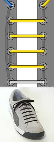 Один конец шнурка протягивается сразу к самому верху, а другой проходит через все дырочки. Подходит для ботинок с чётным количеством пар отверстий.