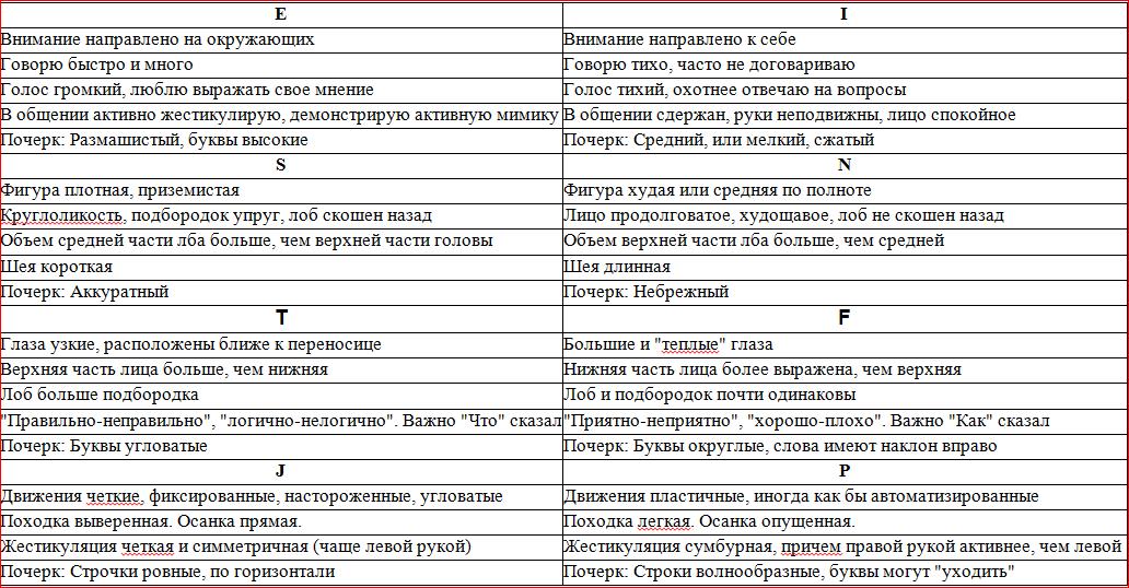 буквенными заголовками: E – I. S – N. T – F. J – P.