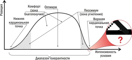 А как действуют условия? Их касается обобщение, выдвинутое в 1913 году американским экологом Виктором Шелфордом: правило толерантности. Согласно правилу (или закону) толерантности Шелфорда, оптимальное для организма значение экологического фактора лежит внутри диапазона толерантности, ограниченного крайними значениями, которые может вынести организм. Обычно колоколообразную зависимость, описывающую реакцию организма на условие, рисуют симметричной, что вовсе не обязательно; на рисунке выше я специально отступил от симметрии.