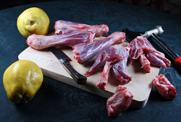 Каждую голень надобно ополоснуть в холодной воде, промокнуть салфетками и отсечь (а лучше - отпилить ножовкой по металлу, чтобы не создавать костных осколков) кончик кости, где начинается постголенный сустав. Толку в нем немного, к тому же трубчатую кость лучше открыть, чтобы костный мозг тоже "поучаствовал" в создании соуса. Мякоть от верхнего основания кости слегка отделить, убрав заодно пленки и сухожилья - так, как это выглядят уже разделанные голени на снимке.