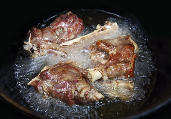 Дальше просто. В казане или глубокой сковороде разогреем то количество растительного масла, в котором удобно обжаривать голени целиком, как в полуфритюре. Разогретое масло слегка посолим, обжарим в нём до коричневого цвета две-три раздавленные дольки чеснока, затем в несколько приемов обжарим сами голени - до хорошего румяного состояния, так, как мы обычно обжариваем косточки при приготовлении плова.