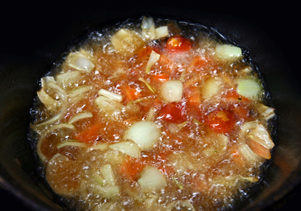 Обжаренные голени переложим в кастрюлю, в которой затем они будут тушиться с овощами, а в то же масло, в котором обжаривались голени, заложим сразу все заготовленные овощи - лук, морковь и помидоры.