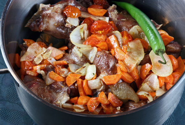Тщательно разровняем продукты и вольём горячую воду - столько, чтобы она лишь слегка покрыла поверхность мяса и овощей. Поставим кастрюлю на умеренно прогретую конфорку и под прикрытой крышкой, добавив горошины черного перца, потушим при слабом кипении час или чуть больше. Тут главный показатель - готовность мяса, за это время оно почти полностью должно дойти до кондиции, стать мягким.