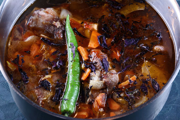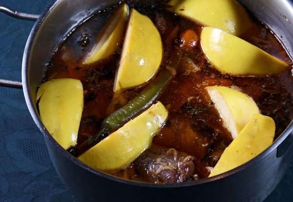 Остается дождаться повторного закипания соуса-бульона, выправить его окончательно на соль и остроту (при желании) и, уже с айвой, потушить блюдо еще 10-15 минут, пока айва не размягчится до приемлемого состояния, потому что её очень легко переварить в пюре.