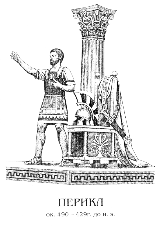 Перикл — знаменитый государственный деятель Афин, с именем которого обыкновенно связывается представление о поре расцвета афинской демократии, греческой литературы и искусства (Периклов век). Сын Ксантиппа, победителя при Микале, и Агаристы, племянницы Клисфена, он родился между 500 и 490 гг. до Р. X. Особенно сильное влияние оказал на него Анаксагор своей возвышенной философией, признававшей разум началом регулирующим и управляющим. Начал свою карьеру Перикл воином, а затем вступил на общественно-политическое поприще. Сам знатного происхождения (по матери Алкмеонид), он примкнул, однако, к демократической партии. Его первым делом было выступление обвинителем в процессе против Кимона, главы аристократической партии, по поводу его действий во Фракии. Перикл был другом Эфиальта, тогдашнего вождя демоса; основываясь на Плутархе, полагали даже, что именно Перикл был истинным виновником и инициатором реформы ареопага, проведённой Эфиальтом и положившей конец политическому влиянию этого учреждения; но это противоречит свидетельству Аристотеля (в «Афинской Политии»). Со смертью Эфиальта (462-461) руководство демократической партией перешло к Периклу. В то время на первом плане стояла борьба с внешними врагами, требовавшая страшного напряжения сил, так как Афинам приходилось воевать и в Египте (с персами), и в самой Элладе (с Коринфом, Эпидавром, Эгиной, затем и со Спартой). Перикл участвовал в битве при Танагре, в которой афиняне были побеждены спартанцами (457). Когда под влиянием этой неудачи обнаружилась реакция в пользу изгнанного посредством остракизма (во время борьбы из-за реформы ареопага) Кимона, то Перикл пошёл навстречу народному желанию и сам внёс предложение о возвращении своего соперника из изгнания раньше срока. Когда спартанцы, вопреки заключённому в 451-450 гг. перемирию, вторглись в Среднюю Грецию, чтобы помочь дельфийцам против фокидян, Перикл тотчас после их удаления возвратил фокидянам обладание дельфийским святилищем. Вскоре в Беотии поднялось восстание против афинского господства; Толмид, поспешивший туда, вопреки совету Перикла, с небольшими силами, пал в битве при Коронее (447-446), окончившейся поражением афинян; вслед за тем восстала Эвбея, отложилась Мегара, спартанцы вторглись в Аттику. Перикл, переправившийся было с войском в Эвбею для подавления восстания, должен был спешить на спасение Аттики. Действуя с большой осторожностью и не вступая в битву, он достиг отступления спартанцев, что объясняли подкупом. Теперь Перикл направил все силы на покорение Эвбеи, которая и подчинилась афинянам. В 445 г. между Афинами и Пелопоннесским союзом заключён был тридцатилетний мир (иначе Периклов), по которому афиняне отказались от всего, что принадлежало им в Пелопоннесе, и возвратились к тому положению, какое занимали до войны; оба союза взаимно признали друг друга. С прекращением войны снова возгорелась борьба внутренняя. Столкновение произошло по вопросу об употреблении союзной казны на украшение города: глава аристократической партии Фукидид находил такое употребление несправедливым. Перикл имел опору преимущественно в городском населении, его противник, вероятно, — в сельском. Только остракизм мог положить конец борьбе, и Фукидид принуждён был отправиться в изгнание. Влияние Перикла достигает теперь своей высшей ст