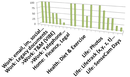 - Пару лет назад я перестал использовать исследовательскую систему MyLifeBits, которая к тому времени успела накопить около 300 ГБ данных. Я оставил её из-за перехода на другую программную платформу и теперь собираю около 1 ГБ в месяц. Часть моей жизни теперь проходит в таких местах, как HealthVault и Facebook, и я стараюсь прилагать усилия к тому, чтобы добавлять все данные в базу и иметь к ним доступ.