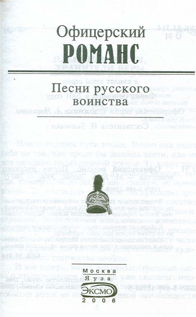А потому в первый раздел сборника вошли тексты известных песен и романсов на стихи русских поэтов от Дениса Давыдова, Михаила Лермонтова до Алексея Жемчужникова. Критерий отбора был не только тематический. Главное состояло не в том, чтобы формально соблюсти избранную тему, но по возможности отобрать именно те песни и романсы, которые поются и сегодня, которые удерживаются общественным сознанием.