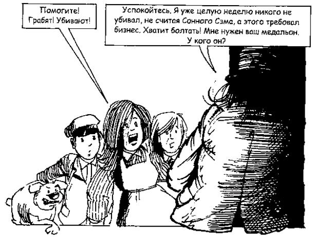 — Что за выражения? — укорил его Мак. — Хорошо, вот что я вам скажу. На рассвете вы принесёте сюда ваш медальон и тогда получите назад своего маленького братика целёхоньким. А не принесёте — получите его обратно кусочками. Решать вам.