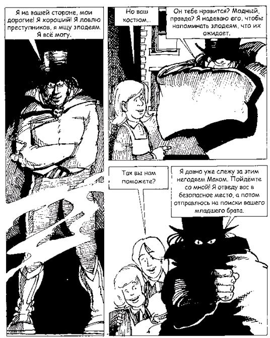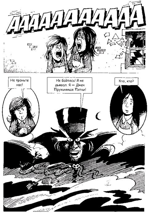 — Я этого так не оставлю! Я верну вашего маленького братца, и вы получите билеты в Америку. Я знаю безопасное место, где вы можете остановиться. Не бойтесь, потому что теперь за дело взялся Джек Пружинные Пятки…