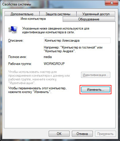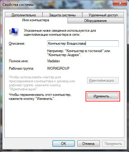 В поле Описание: укажите описание компьютера, например Компьютер Степана. Нажмите кнопку Изменить.