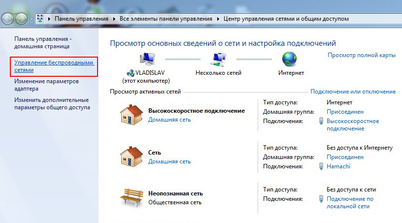 Нажмите ссылку Управление беспроводными сетями.