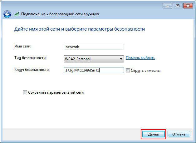 В поле Ключ безопасности: введите пароль. Пароль должен состоять от 8 до 63 знаков. Если выбрано шифрование WEP, то пароль должен состоять из 5 или 13 знаков. Чем длиннее пароль тем лучше. Для создания пароля лучше использовать генератор паролей. Нажмите кнопку Далее.