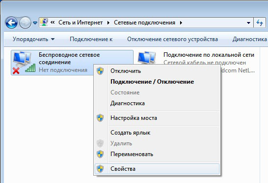 Щелкните правой кнопкой мыши по значку беспроводного сетевого адаптера и выберите пункт Свойства.
