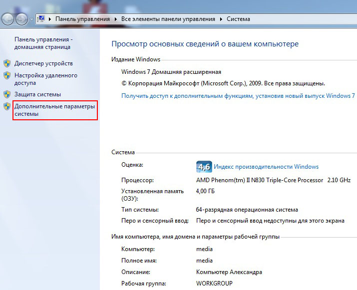 Выберите пункт меню Свойства. Щелкните по ссылке Дополнительные параметры системы.