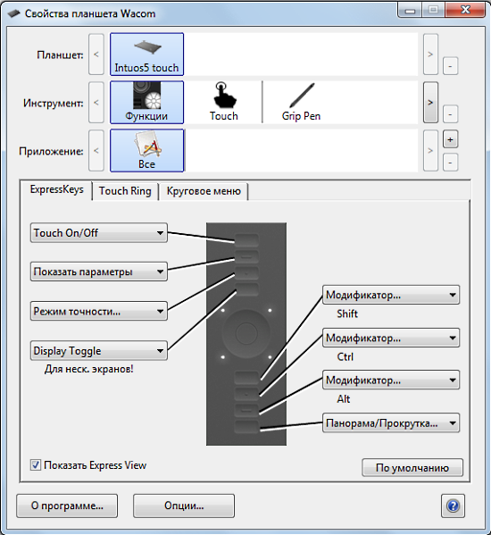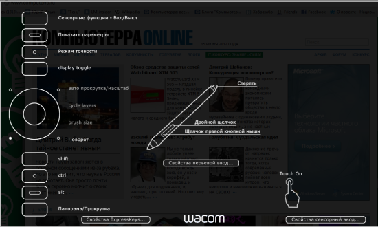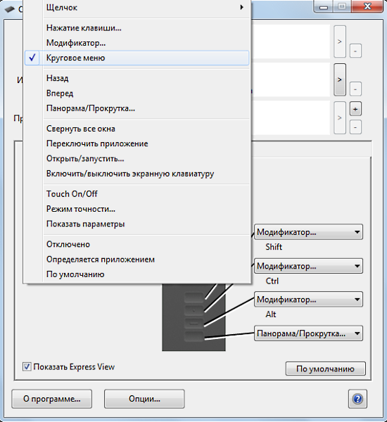 Через это меню настраивается большинство функций, доступных для планшета. Но почему-то одна из главных находок — так называемое «Круговое меню» — по умолчанию ни на одну из экспресс-клавиш не назначено.