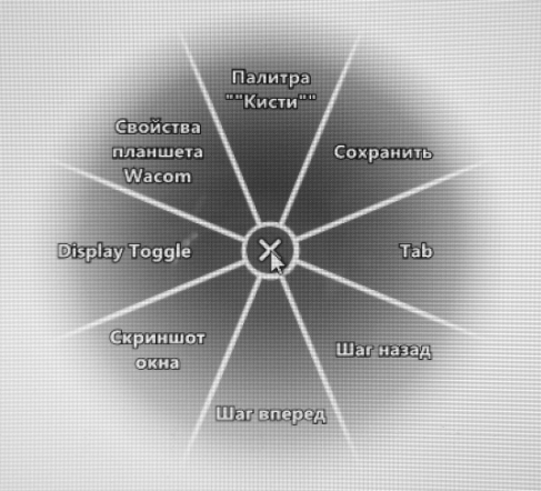 Круговое меню выводится в точности там, где в данный момент располагается курсор, — чтобы переключение команд занимало как можно меньше времени. Как можно увидеть на скриншоте, по умолчанию на круговое меню назначается ряд сугубо клавиатурных команд («Сохранить», «Шаг вперёд», «Шаг назад» и так далее). Набор этих команд можно настраивать отдельно для каждого конкретного приложения: