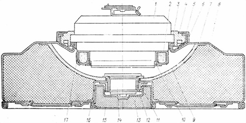 а – общий вид; б – разрез; 1 – взрыватель; 2 – вышибной заряд; 3 – прокладка; 4, 5, 6 и 10 – кольца; 7 – корпус; 8 – заряд ВВ; 9 – облицовка кумулятивная; 11 – фланец; 12 – втулка; 13 – ВВ детонатора; 14 – ПИМ; 15 – корпус детонатора; 16 – стакан; 17 – корпус вышибного заряда