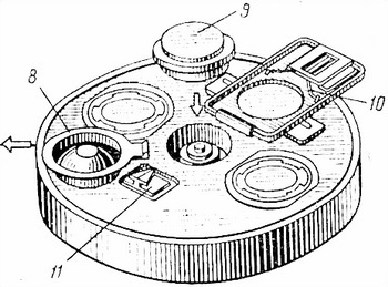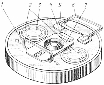 Нить, намотанная на катушку, удерживает скобу 6 (рис. 4) в нижнем положении. Один конец нити прикреплен к крышке 1 дистанционного механизма, второй свободен. Скоба удерживает шток 8 (рис. 3) гидрозамедлителя в прижатом состоянии и не дает возможности движку 7 предохранительно-исполнительного механизма взрывателя перевестись в боевое положение.