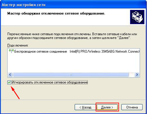 Поставьте галочку Игнорировать отключенное сетевое оборудование. Нажмите кнопку Далее.