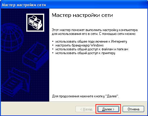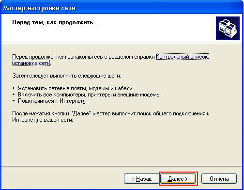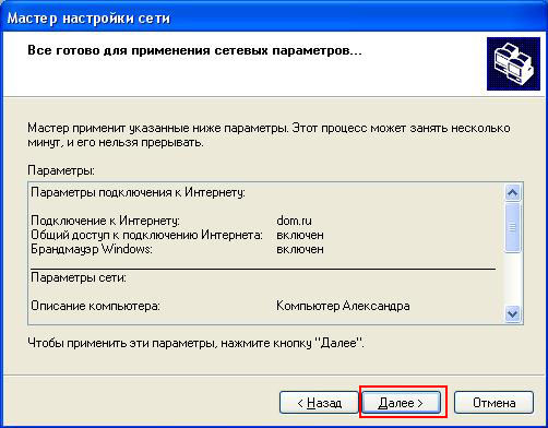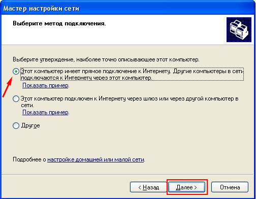 Отметьте пункт Этот компьютер имеет прямое подключение к интернету. Другие компьютеры в сети подключаются к Интернету через этот компьютер. Нажмите кнопку Далее.