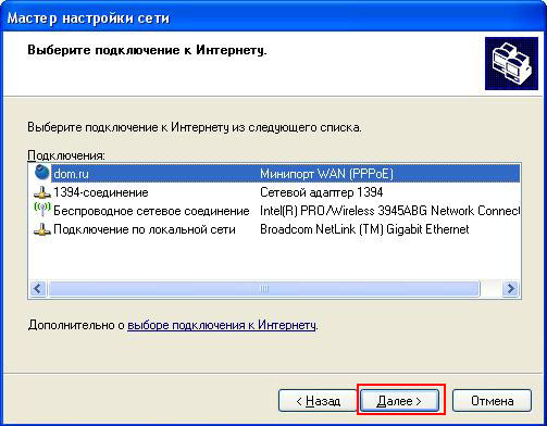 В списке выберите подключение к интернету. Нажмите кнопку Далее.