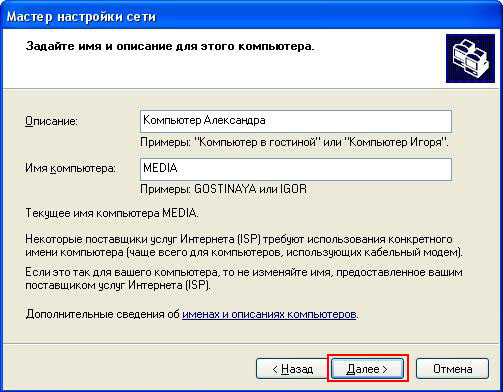 В поле Рабочая группа: укажите имя рабочей группы. Имя рабочей группы должно быть одинаковым на всех компьютерах сети. Нажмите кнопку Далее.