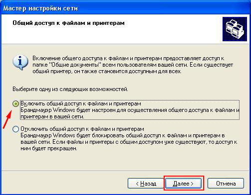 Если вы будете использовать общий доступ к папкам и файлам, то отметьте пункт Включить общий доступ к файлам и принтерам. Нажмите кнопку Далее.