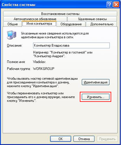 В поле Описание: задайте описание компьютера, например компьютер Федора. Нажмите кнопку Изменить…