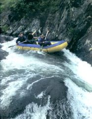 В самом начале маршрута есть непроходимый для нашего плота водопад; здесь проходит граница скальных плит, и река с грохотом падает вниз, поднимая клубы водяной пыли. Пришлось обходить его берегом, перетаскивая и плот, и вещи. Далее прохождение препятствий требует элементарного внимания и слаженных действий экипажа. За всю историю наших походов на плоту не было ни одного случая группового купания. Правда, кое-кто вываливался в семиградусную воду по нескольку раз, но это, кроме непродолжительных и очень веселых спасработ, не создавало никаких сложностей. В некоторых сплавах с сознательными иностранными господами нам без труда удавалось управлять судном с помощью нехитрых команд, но в случае с земляками команды не проходили. Любые приказы, исходящие от кормчих, воспринимались всеми по-разному, часто вызывая бурные дискуссии.