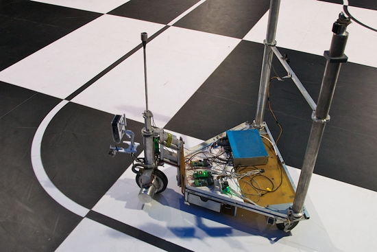 Насмотревшись на неторопливую поступь Hexapod, я прошу показать мне, как устроена одна из колесящих по площадке «табуреток на колёсиках». Одной из них, похоже, можно управлять при помощи iPod touch. Этого трудно не заметить: сидящие напротив студентки с энтузиазмом размахивают айподом в воздухе, а робот в ответ вертится и совершает причудливые манёвры.