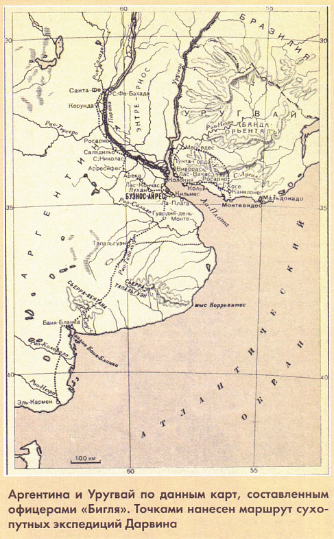 Побывав во всех этих экзотических странах, молодой Чарльз Дарвин собрал богатейший материал о тамошней фауне, флоре и особенностях геологического строения. Иногда он подолгу оставался на суше и даже совершал длительные сухопутные путешествия, возвращаясь на корабль в условленном месте. В сферу внимания штатного натуралиста «Бигля» попали также ископаемые остатки давно вымерших животных, находимые в земле. В частности, ряд потрясающих палеонтологических находок были им сделаны близ города Баийя-Бланка на побережье Аргентины.
