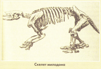 На океанском берегу близ Баия-Бланка в толще красной глины Дарвин обнаружил кости гигантских млекопитающих, совершенно непохожих на ныне живущих. Эти находки были им вкратце описаны в книге "Путешествие натуралиста вокруг света на корабле «Бигль», не такой строго-академической, как "Зоологические результаты", и увлекательной, как роман Жюля Верна: "Сюда относятся, во-первых, части трех черепов и другие кости мегатерия, самое название которого говорит о его колоссальных размерах. Во-вторых, мегапонихс — огромное животное, родственное первому. В-третьих, сцелидотерий — также близкое к ним животное; мне удалось найти почти полный скелет его. Величиной он был, должно быть, с носорога; по строению черепа он, оказывается, по мнению м-ра Оуэна, ближе всего к капскому муравьеду, но в некоторых других отношениях приближается к броненосцам. В-четвертых, Mylodon darwinii, принадлежащий к роду очень близкому, но немного меньших размеров. В-пятых, еще одно гигантское четвероногое из неполнозубых. В-шестых, крупное животное с покровом из костяных пластинок, очень похожим на панцирь броненосца. В-седьмых, лошадь вымершей породы, к которой я еще вернусь. В-восьмых, зуб какого-то толстокожего, вероятно макраухении, громадного животного с длинной, как у верблюда, шеей; к нему я также вернусь в дальнейшем. Наконец, токсодон, быть может одно из самых диковинных из когда-либо открытых животных: величиной он равняется слону или мегатерию, но строение его зубов, как установил м-р Оуэн, неоспоримо доказывает, что это близкий родственник грызунов — отряда, к которому в настоящее время относятся по большей части самые маленькие четвероногие; многие черты приближают его к Pachydermata; судя по расположению глаз, ушей и ноздрей, это было, вероятно, водяное животное вроде дюгоня или ламантина, к которым он также близок. Как удивительно признаки всех этих различных отрядов, в настоящее время так резко разграниченных, сочетались друг с другом в различных особенностях строения токсодона!".