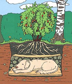 — И завтра он не проснется. Он ушел от нас навсегда. Полкан будет постепенно разлагаться и удобрять землю. Сейчас мы посадим рядом куст шиповника. И когда на шиповнике будут появляться плоды, мы будем знать, что это привет от Полкана. Ведь он удобряет землю, на которой получает соки куст. А весной, когда на березе появятся первые листочки, мы скажем: «Это Полкан посылает нам привет». Пройдет много-много лет, и от Полкана не останется даже косточек. Он станет землей. А береза и шиповник останутся и будут напоминать тебе, Алешенька, о старом верном друге.