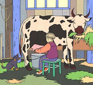 Сначала у него ничего не получалось. Но Пеструха стояла смирно, а прабабушка Анна так терпеливо и ласково его поучала, что Алеша надоил целую кружку молока.