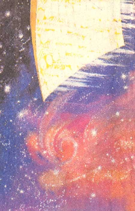 У затишній круглій кімнаті на другому поверсі вежі було накрито стіл, за яким Наталя і пригощала нас міцною кавою, а також розповідями про туристську мандрівку на Альфа Проціон — планету в сузір’ї Візничого, звідки вона кілька днів тому повернулася. В кімнаті сутеніло. Наші обличчя освітлювали лише кольорові свічки, які мерехтіли у старовинних канделябрах на опоряджених блакитним шовком, у стилі ретро, стінах. Стереосистема сповнювала кімнату неголосною феєричною музикою.